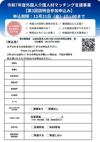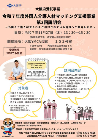 大阪府「令和7年度 外国人介護人材マッチング支援事業」の第3回説明会の日程が決まりましたので、ご案内いたします。